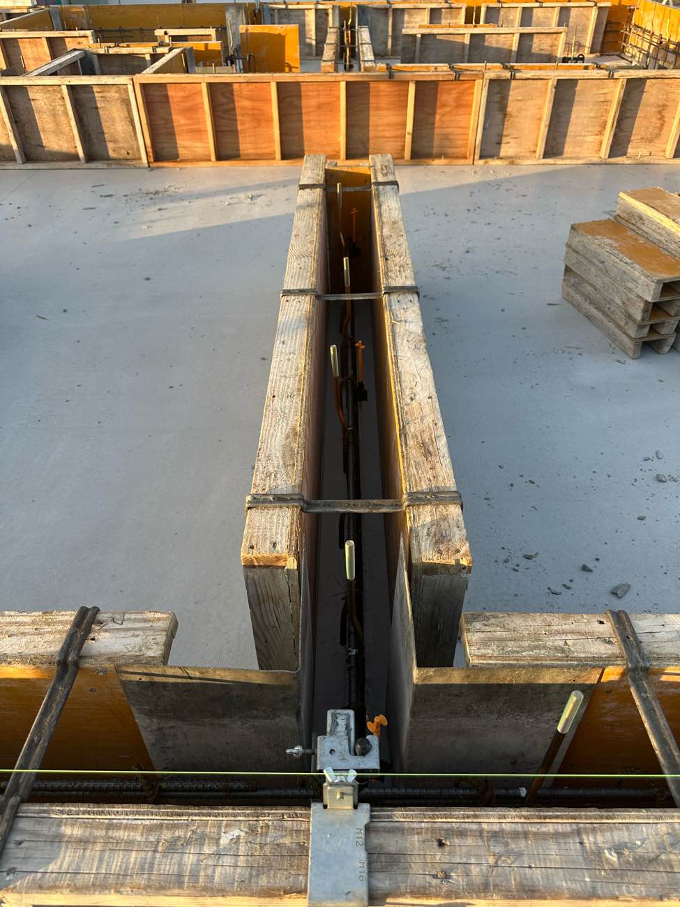 まずは基礎の底となる「ベース部分」に型枠を設置し、そこへコンクリートを流し込みます。