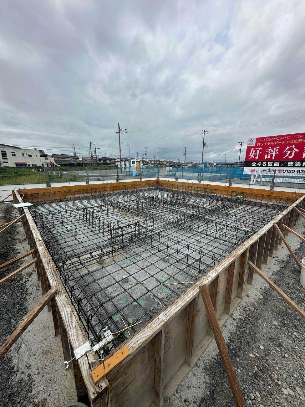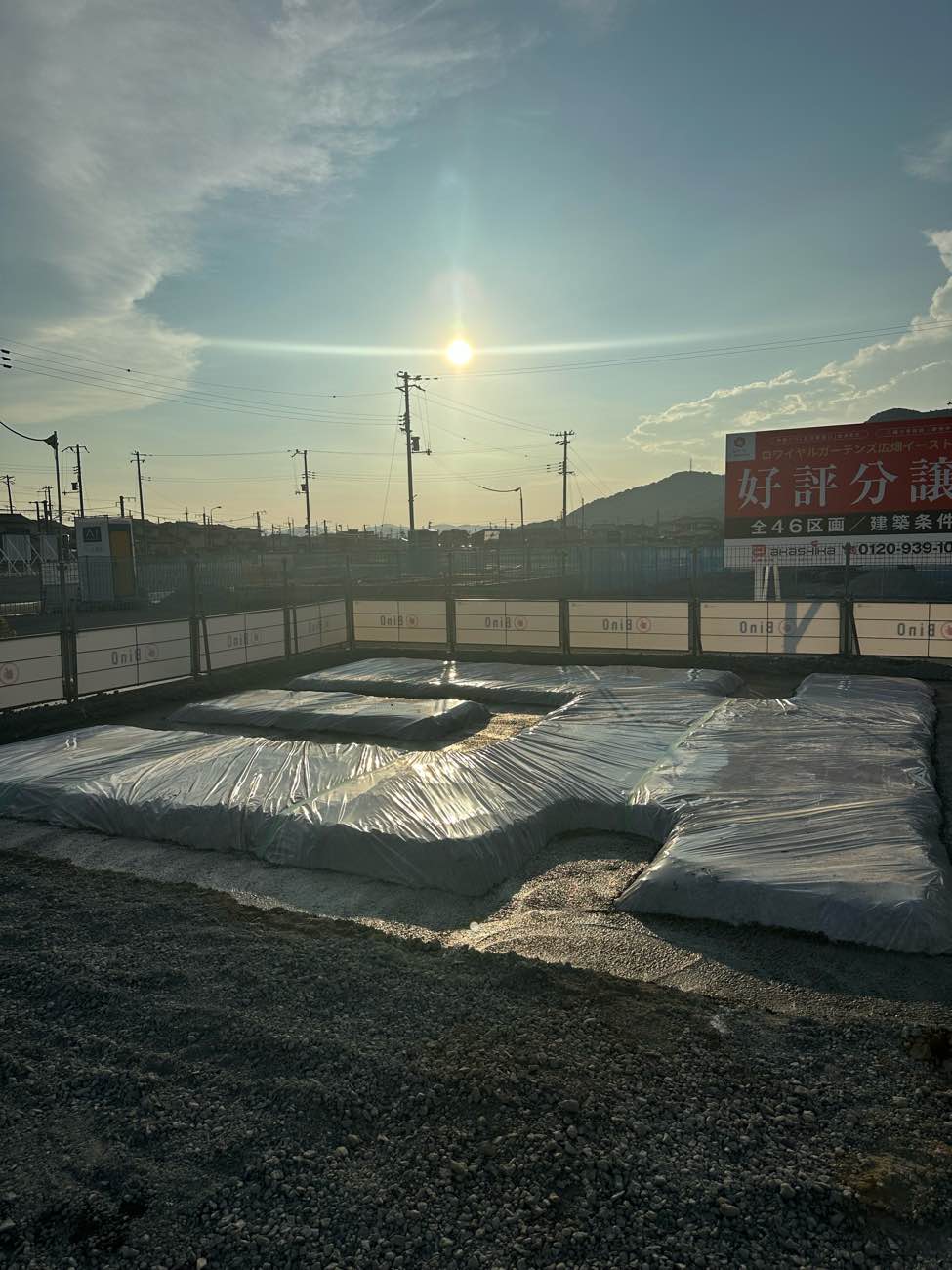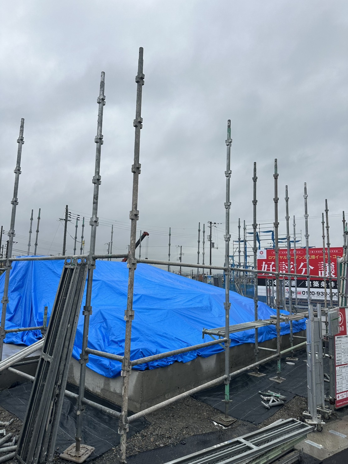 次に、防湿シートを敷いて湿気対策を行い、鉄筋や型枠を正確に設置するための「捨てコンクリート」を打設。構造には関わらない部分ですが、施工の精度を左右する大切な工程です。