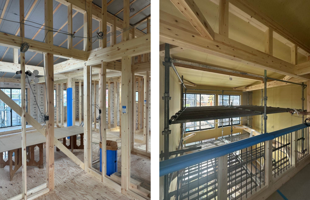 大きな吹き抜けが特徴の”BOOOTS”では、作業がしやすいように室内にも足場を組み立てて工事を進めていきます。