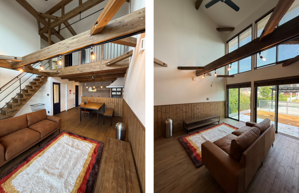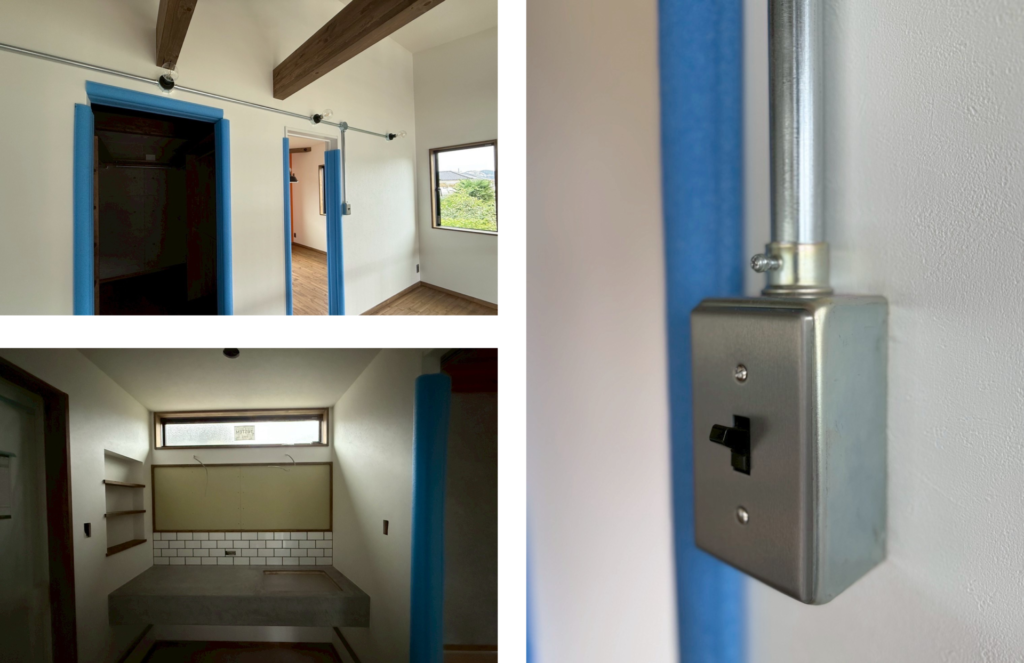 2階のフリースペースにはあえて露出配管で照明・スイッチを設置し、無骨な雰囲気を演出。