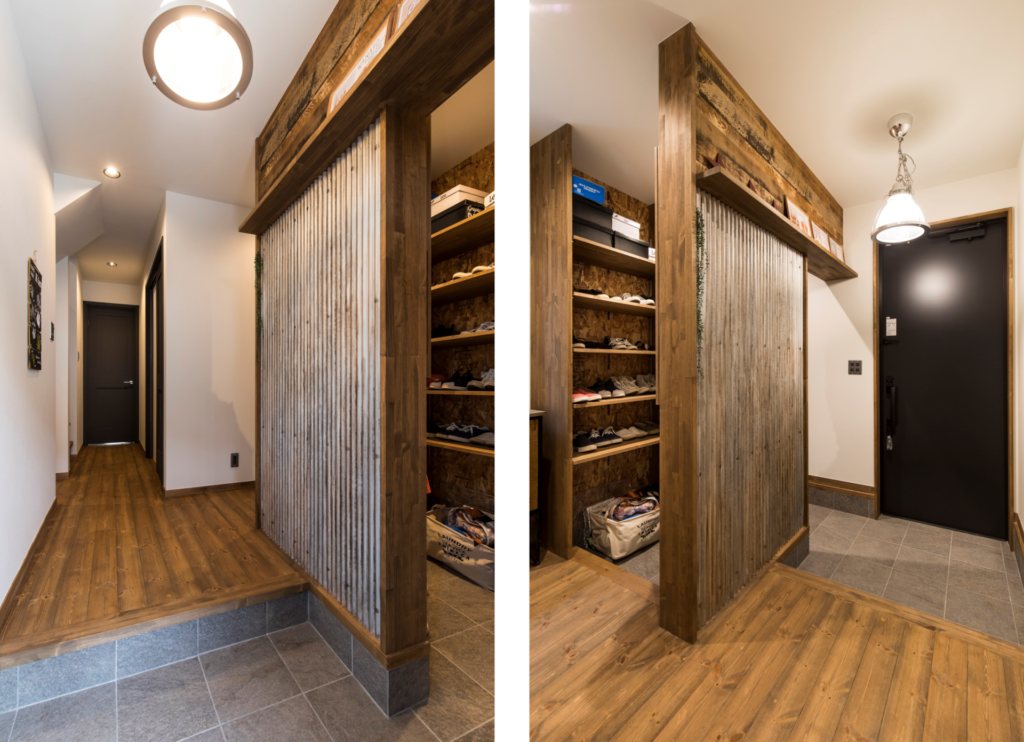 ●波板×古材の壁で仕切る機能的な玄関とシューズクローク