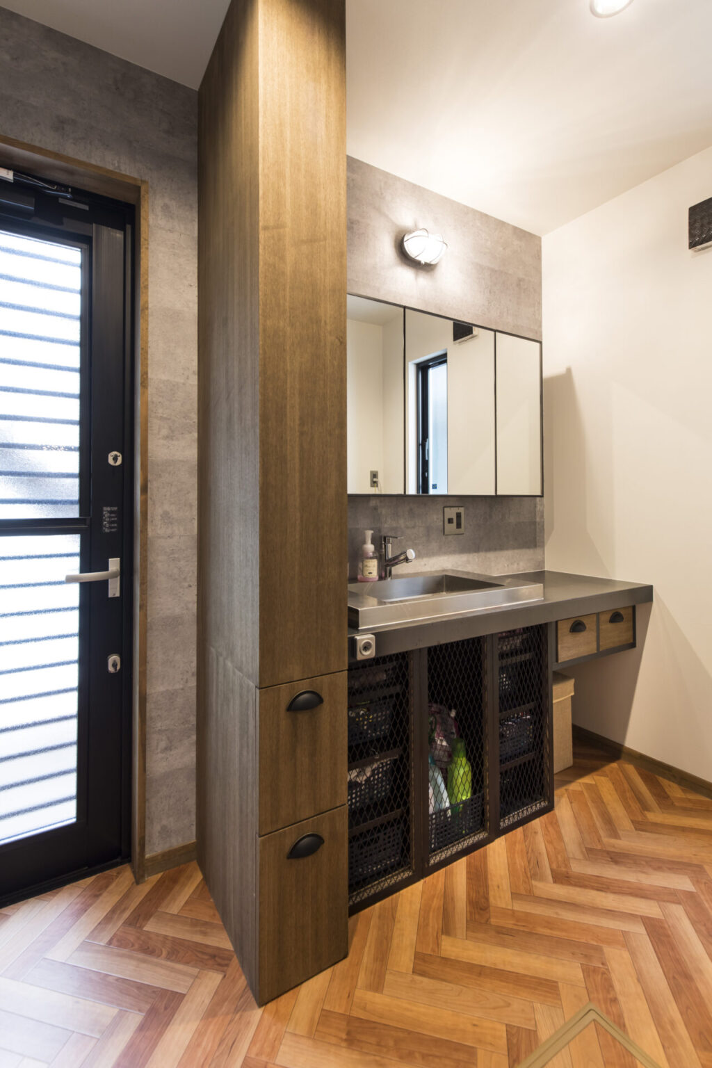 ステンレスの洗面ボウルやアイアンメッシュの扉が、素材の個性を引き立てながら機能性も確保。