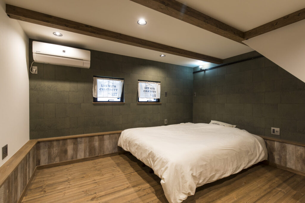 少し低めの天井が、包まれるような安心感を生み出す寝室。