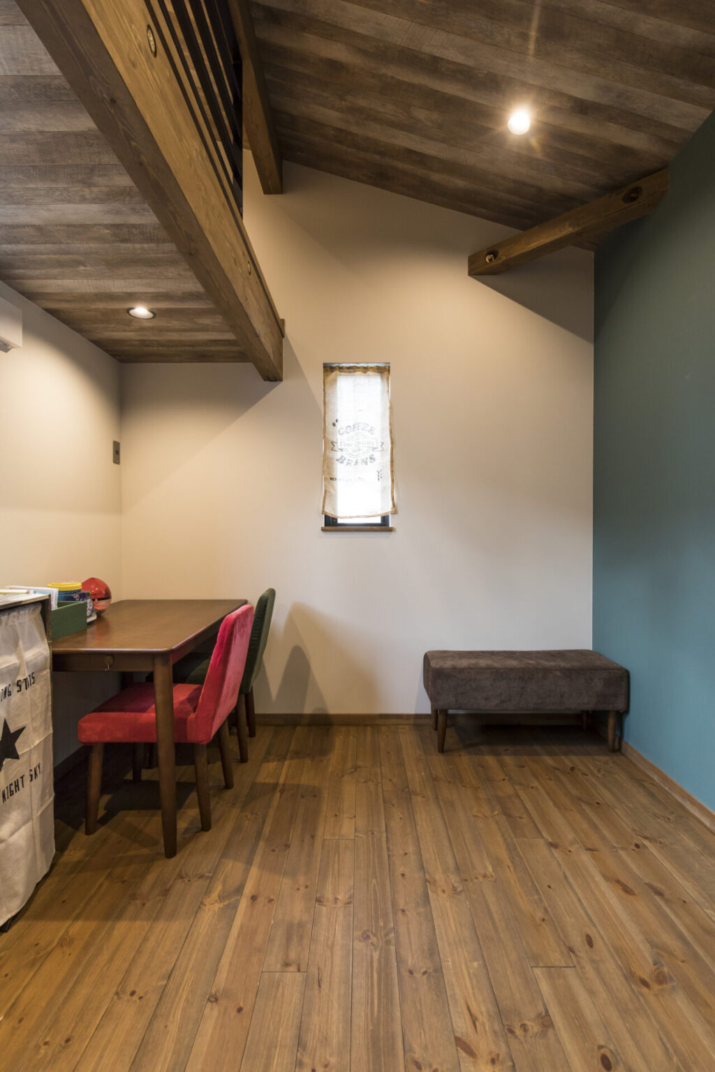 ヴィンテージ調の木目クロスが天井を彩り、味わい深く温かみのある雰囲気に包まれながら、毎日がワクワクする居場所に。