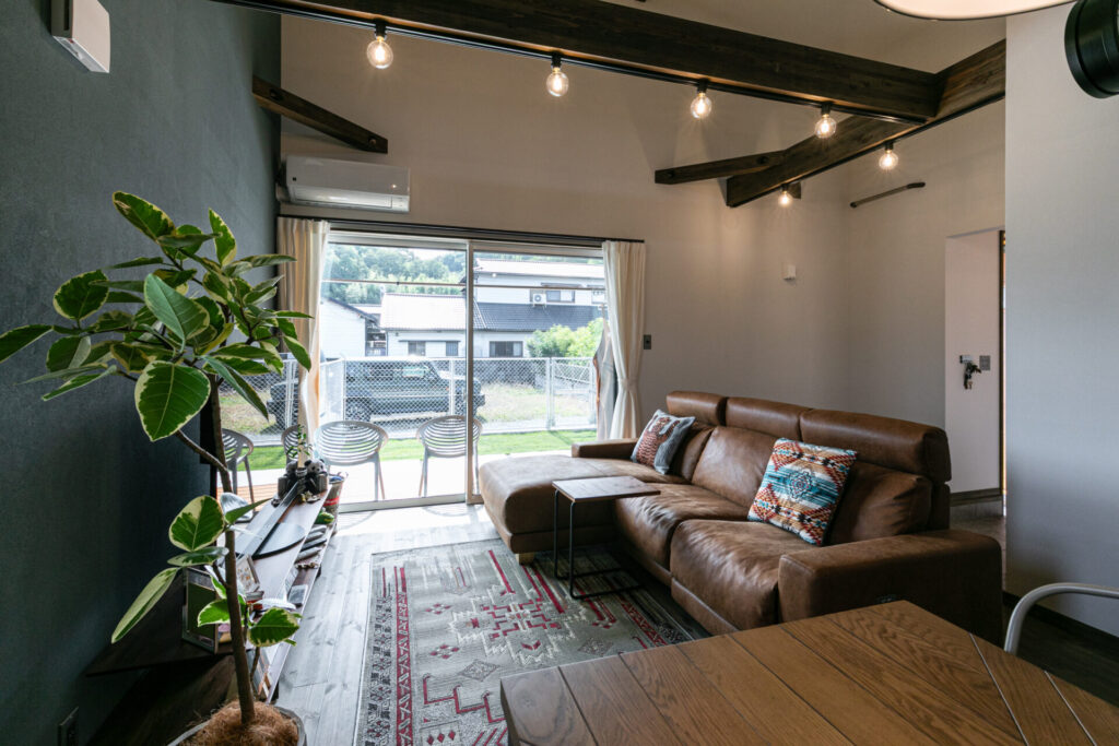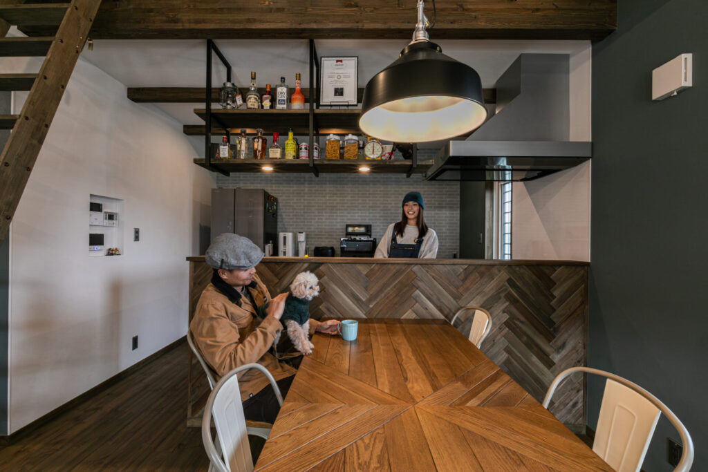 古材やアイアンを取り入れたインテリアでトータルコーディネートし、ラフさと重厚感がほどよく調和した、居心地のよい空間にまとめました。