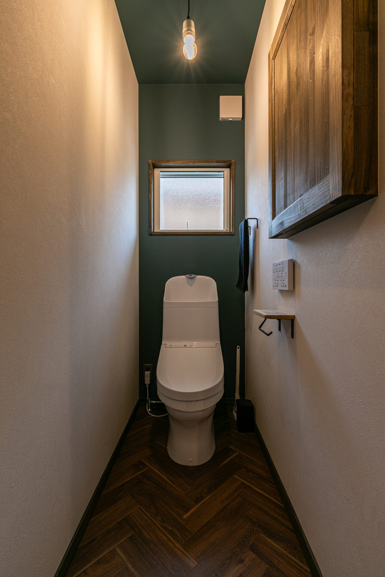 天井と正面の壁にアクセントを加えることで、コンパクトな空間ながら奥行きを感じられるトイレです。