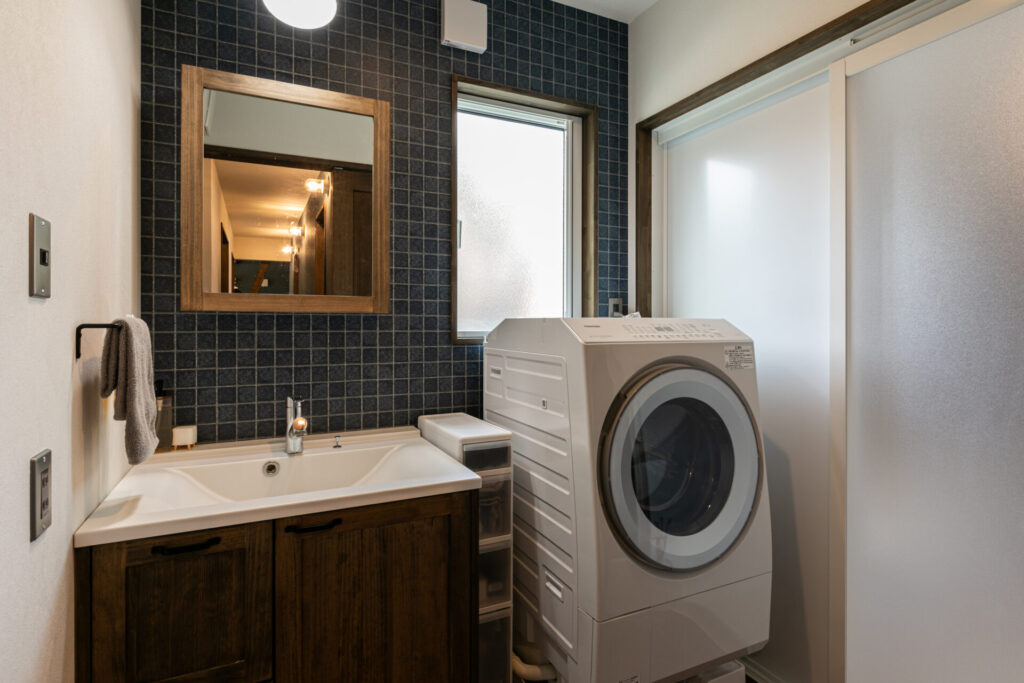 ウッドワン製の無垢の木の洗面台を採用し、木の質感をそのまま楽しめる洗面空間。