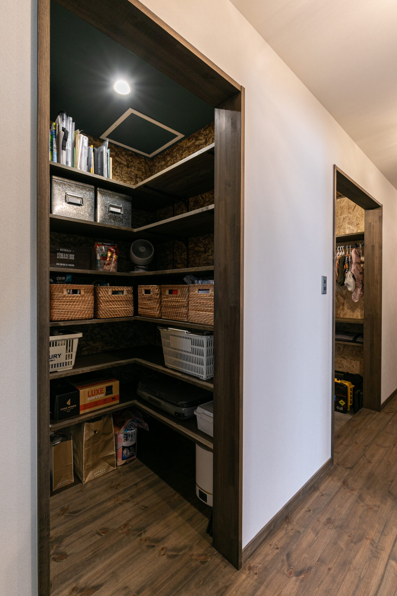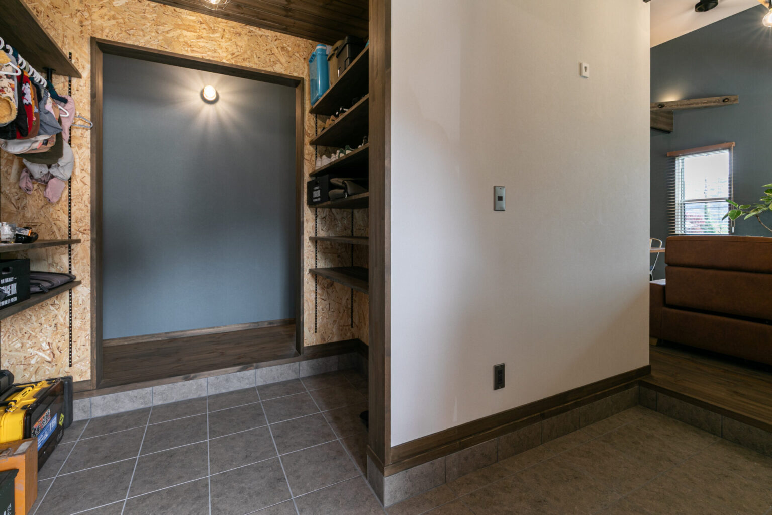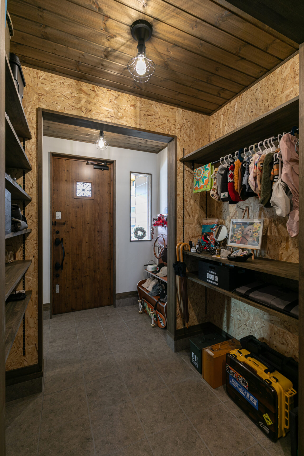 ウォークスルータイプのSCLの壁はOSB合板貼りとし、可動棚を組み合わせることで、愛犬のお洋服やお散歩グッズもおしゃれに収納できる玄関に仕上げました。