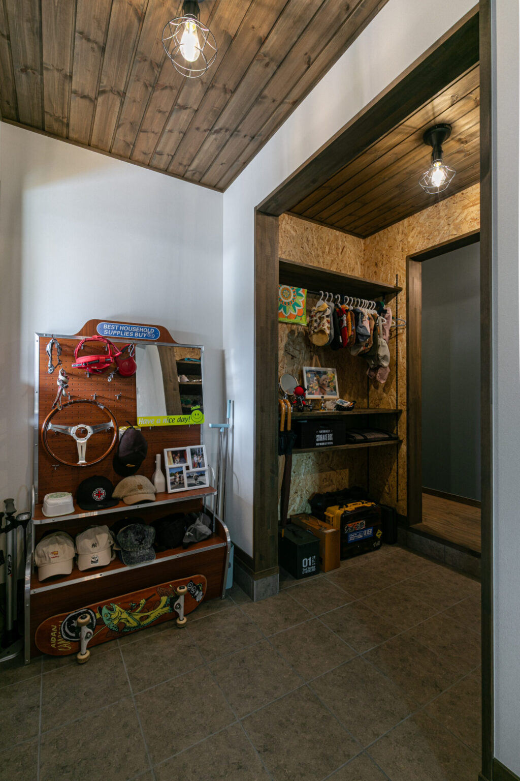 玄関にはアメリカンなディスプレイラックを設け、帽子などの小物をラフに飾れる空間に。