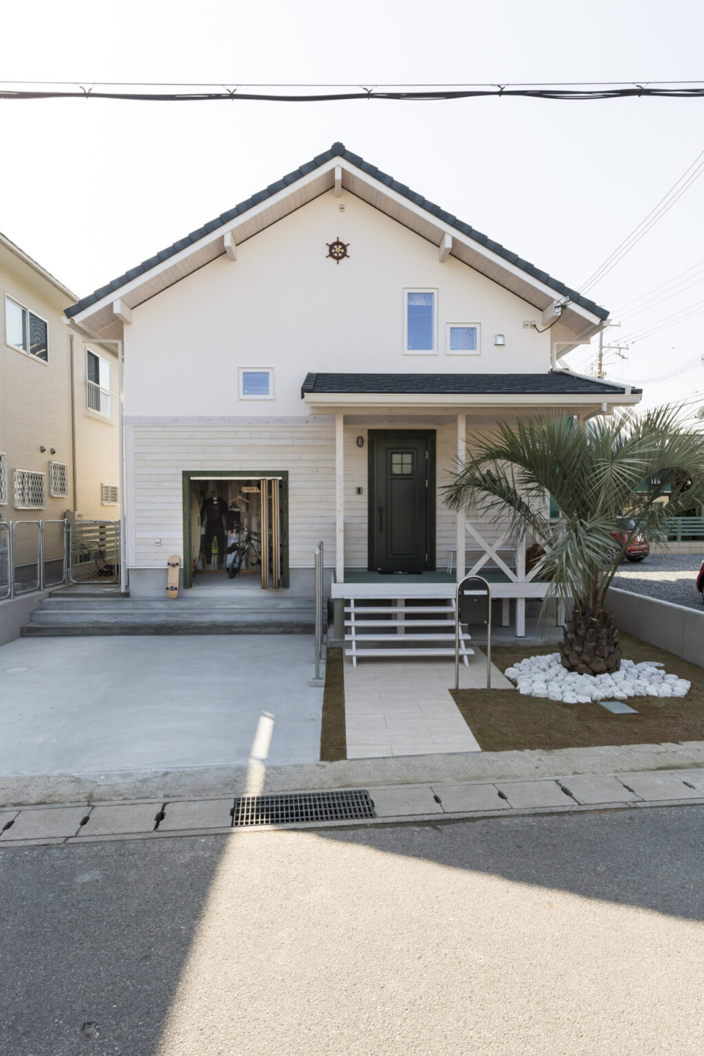 屋根と玄関ドアがさりげないアクセントになり、シンボルツリーのココスヤシが爽やかさを演出。