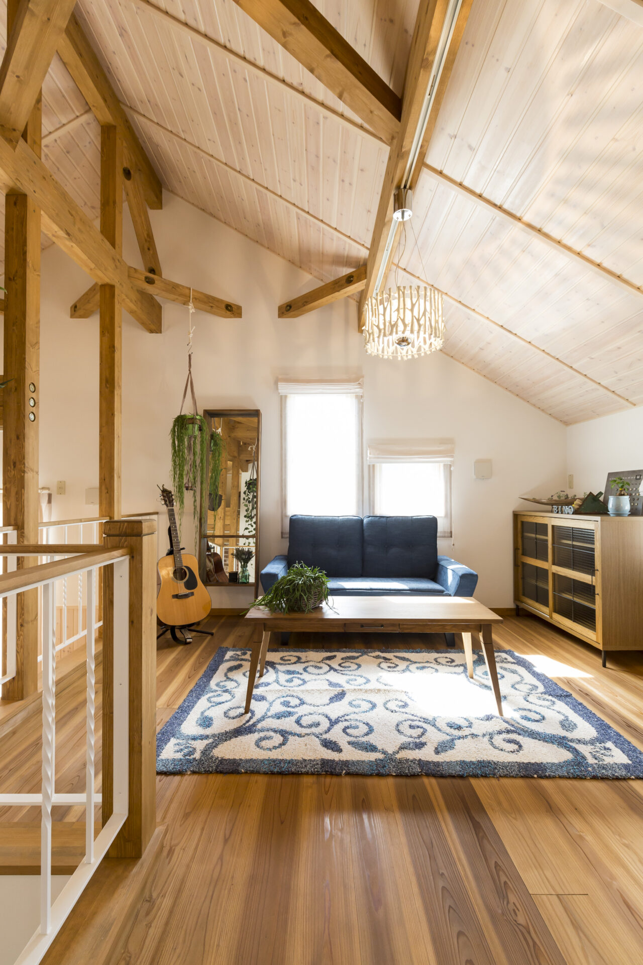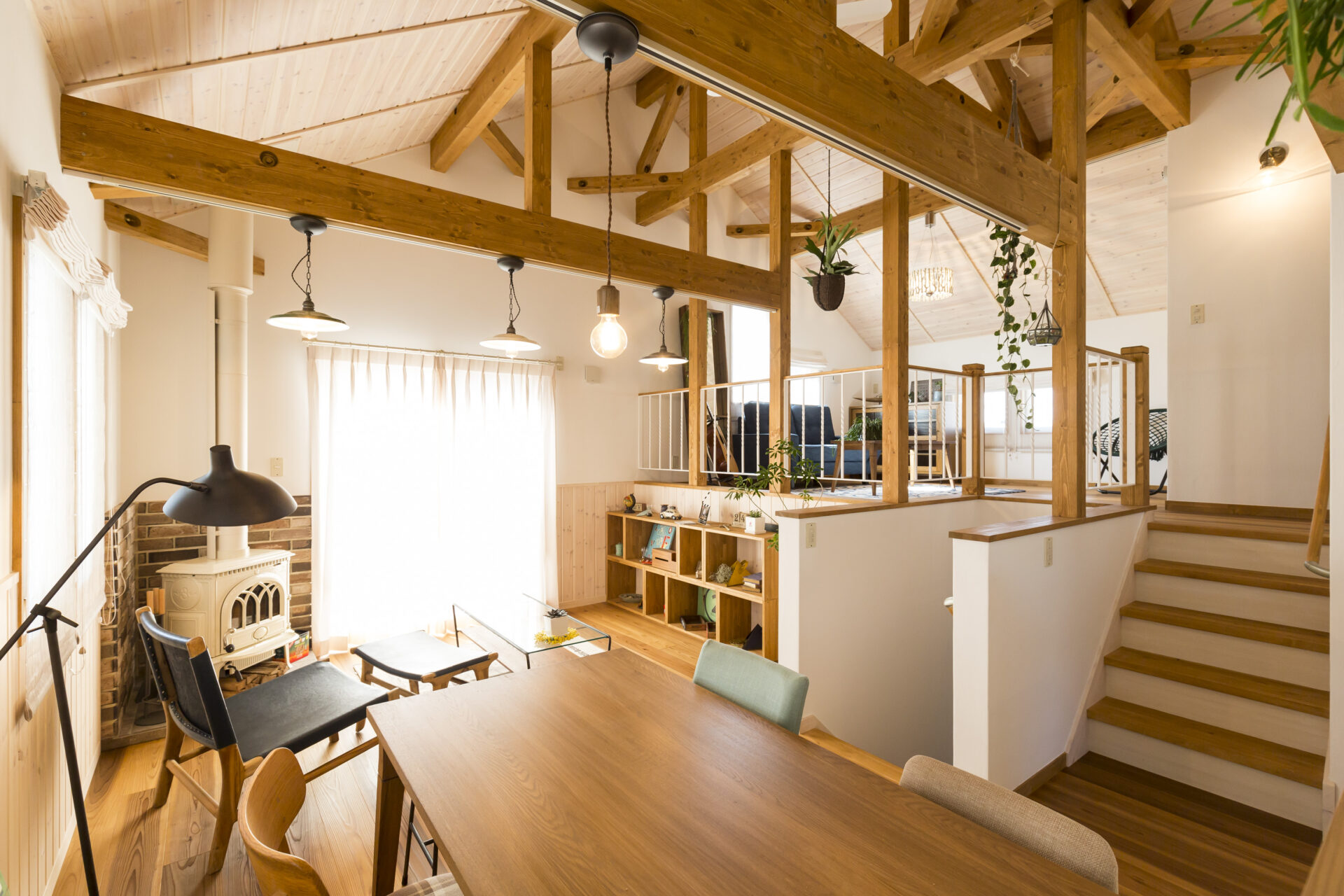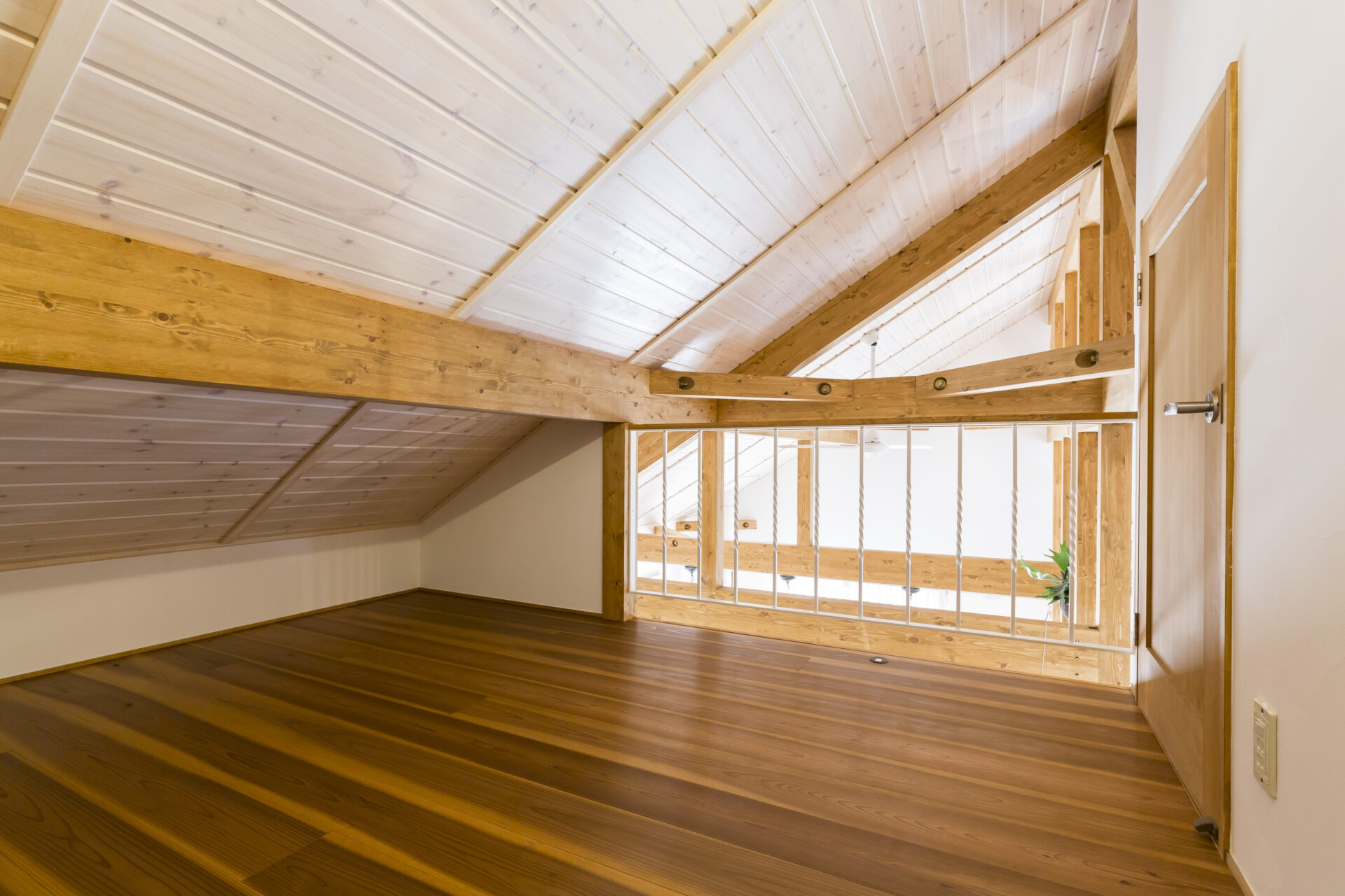 三角屋根のかたちを活かした勾配天井で、小屋裏のような特別感のある空間に。