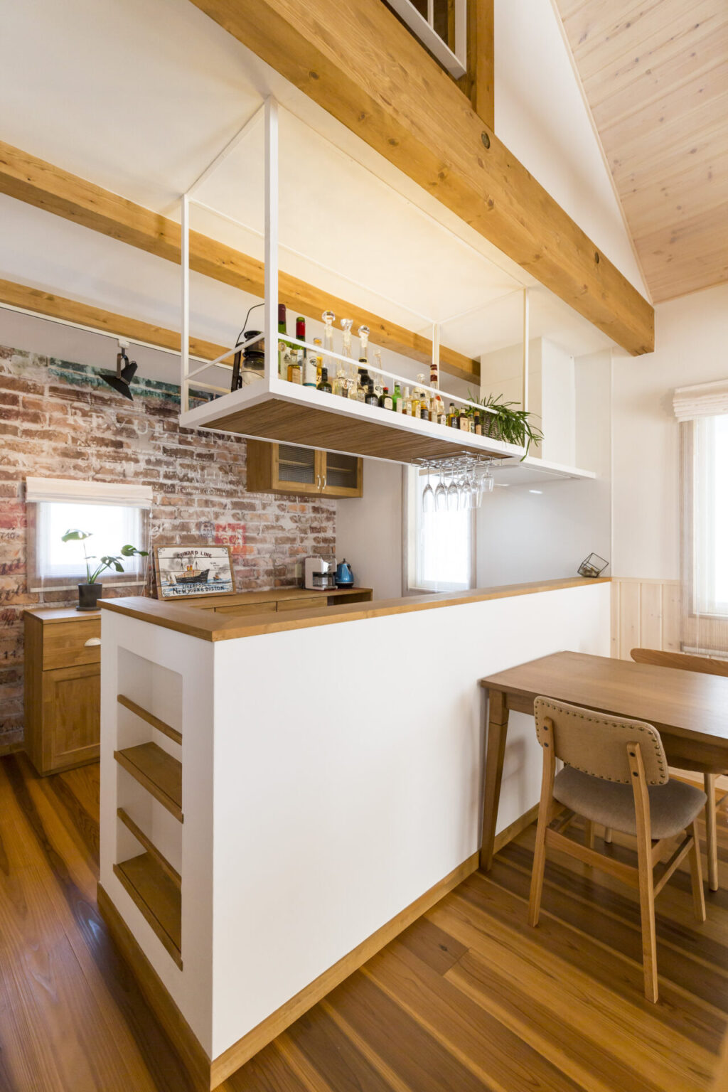 棚に仕込んだ間接照明が、夜にはほんのりとした灯りを演出し、バーのような時間も味わえます。