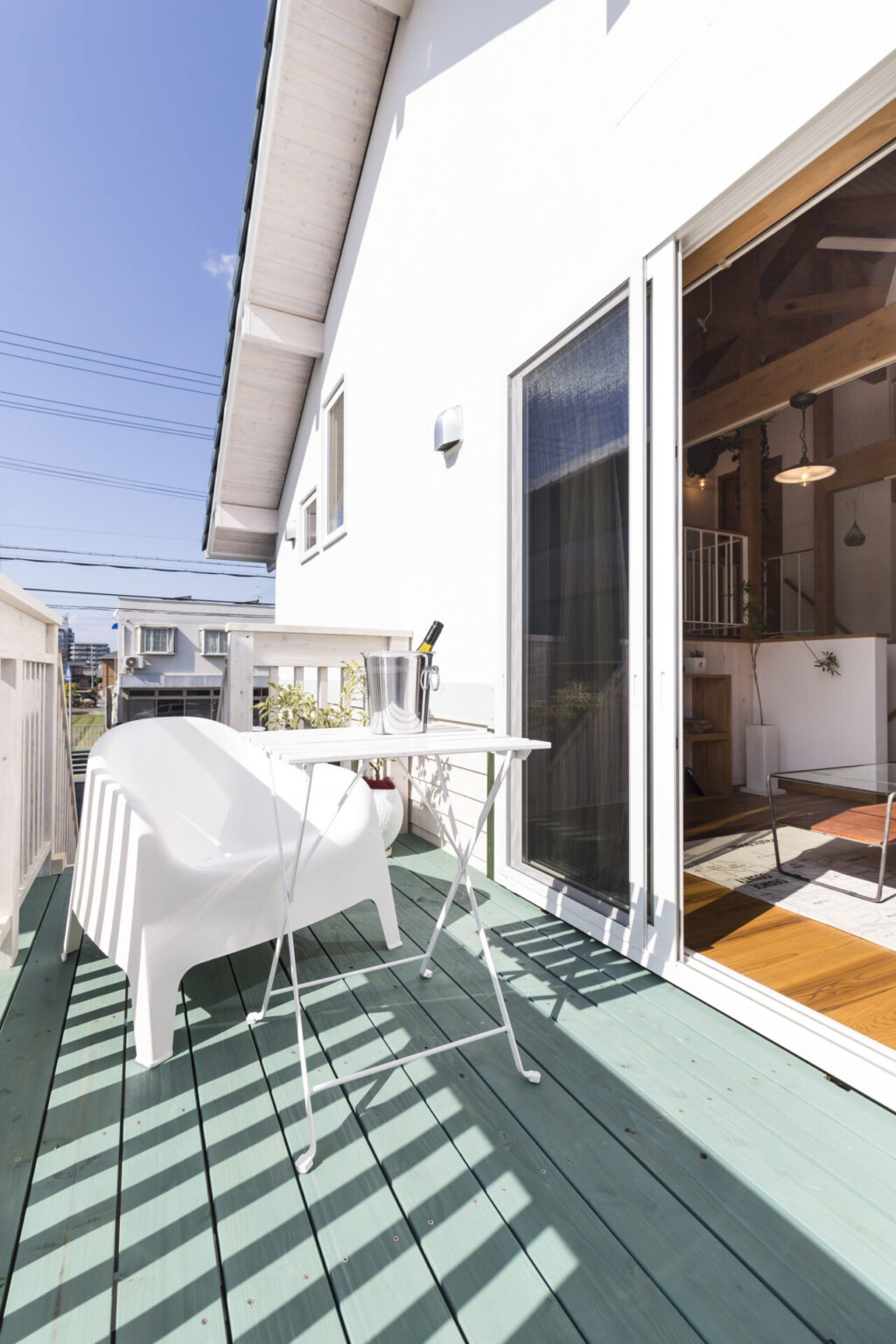 木の温もりを感じるウッドバルコニーは、家の中から自然につながる特別な場所。