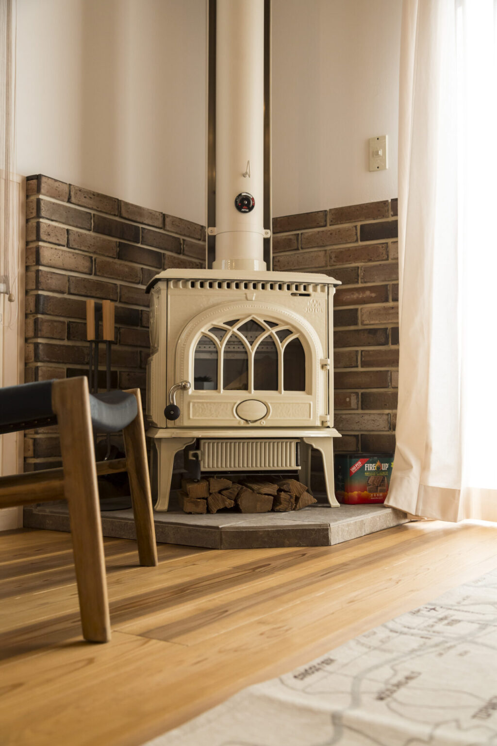 リビングの一角に設けた薪ストーブは、やわらかなクリーム色で空間にやさしく馴染みます。