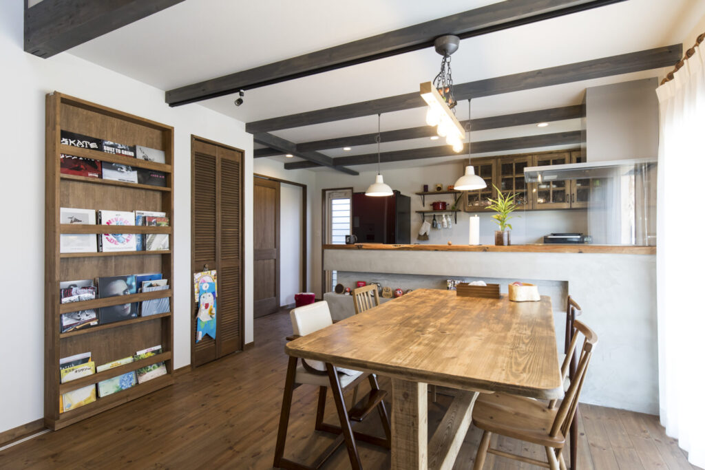 木のぬくもりが広がるLDKの中で、モルタルと古材を組み合わせた造作カウンターが存在感を放ちます。