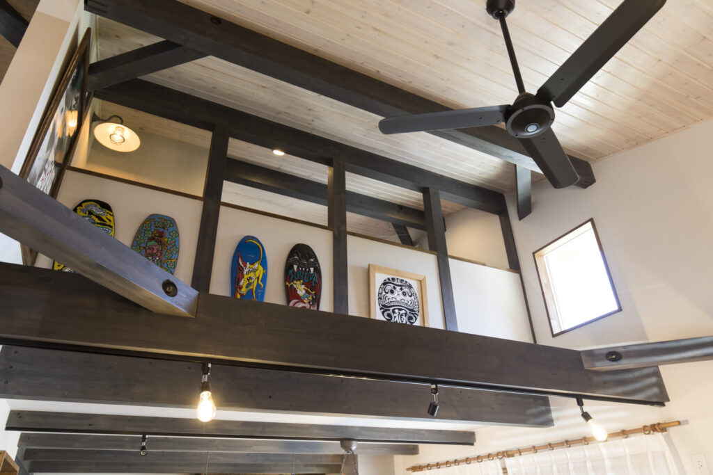 見上げると、存在感のある梁が浮かび上がり、空間に奥行きを与えます。