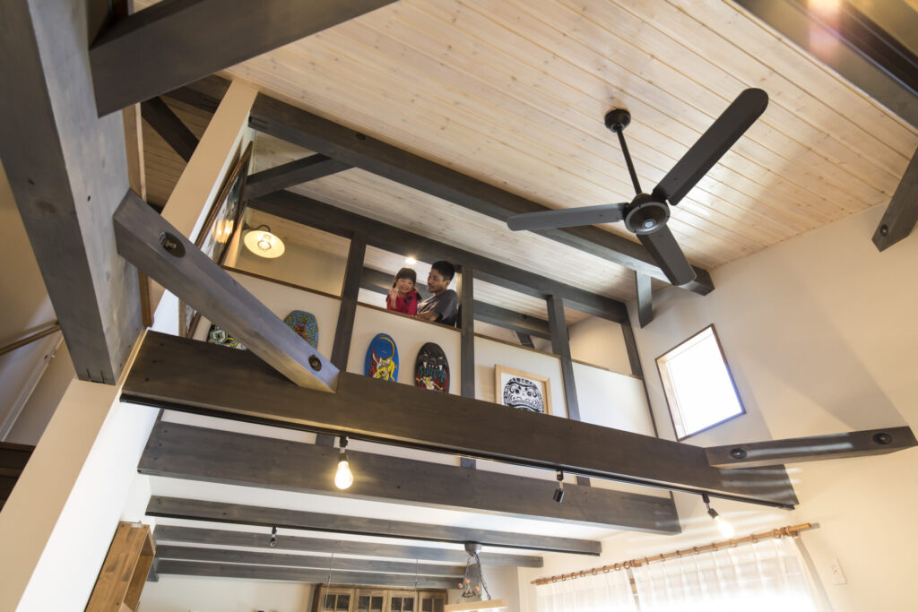 フリースペースは吹き抜けを通じて1階とつながり、家全体に一体感が生まれています。