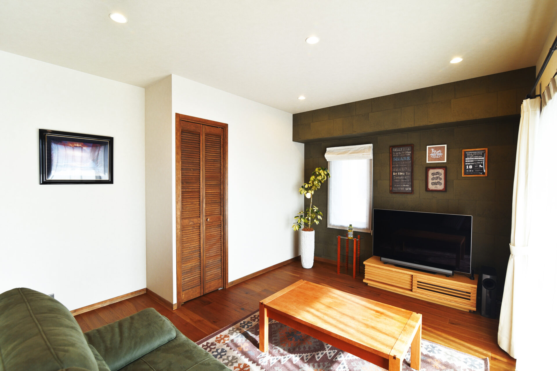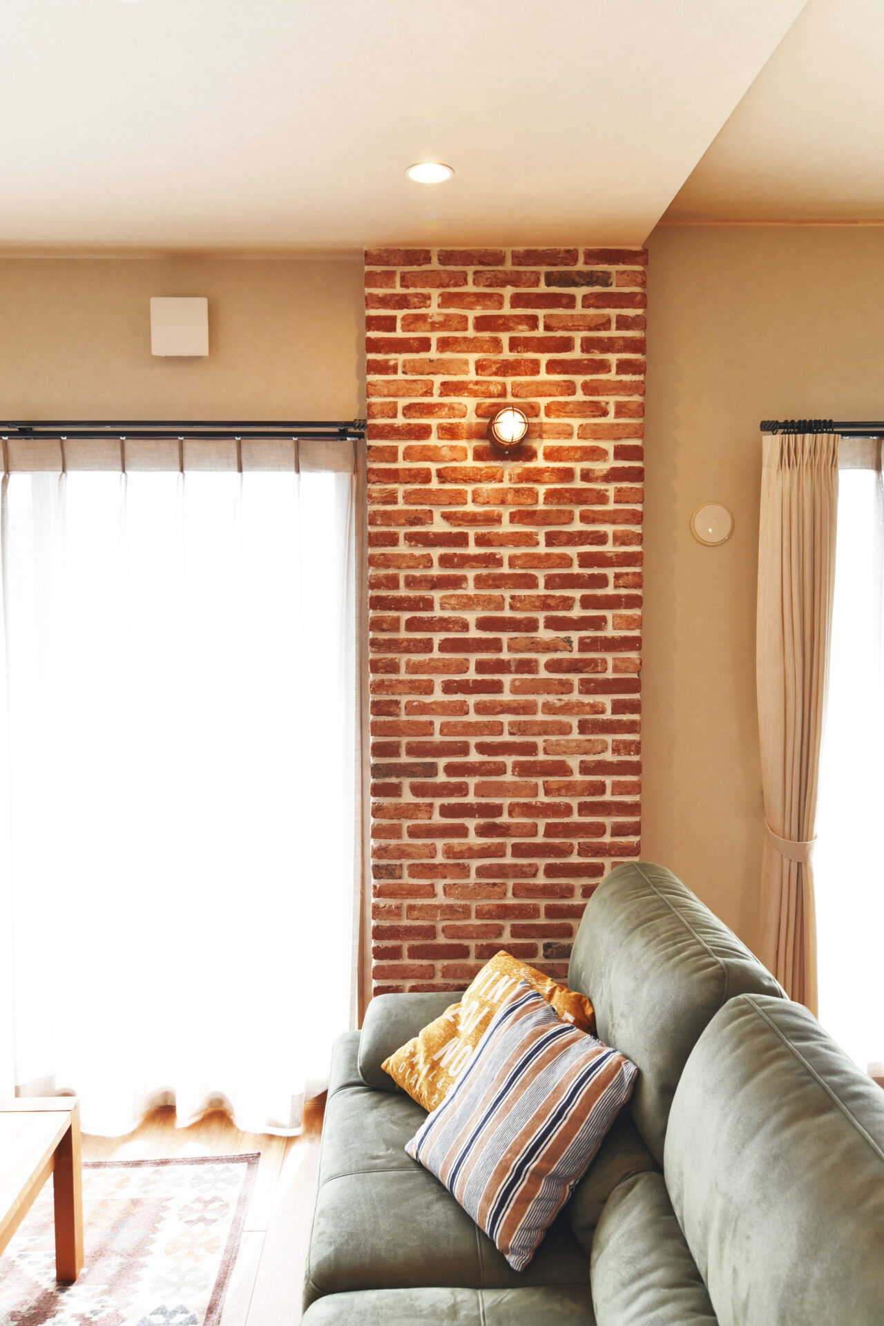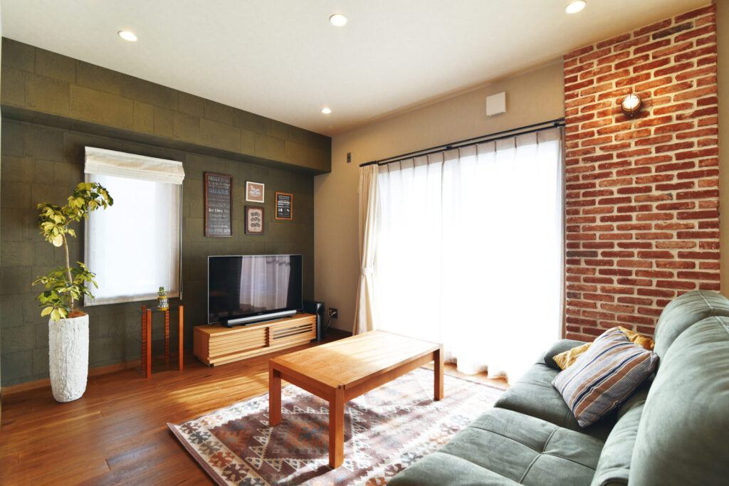 レンガ貼りの壁とモスグリーンのアクセント壁で、落ち着きと温かみのある空間に仕上げました。