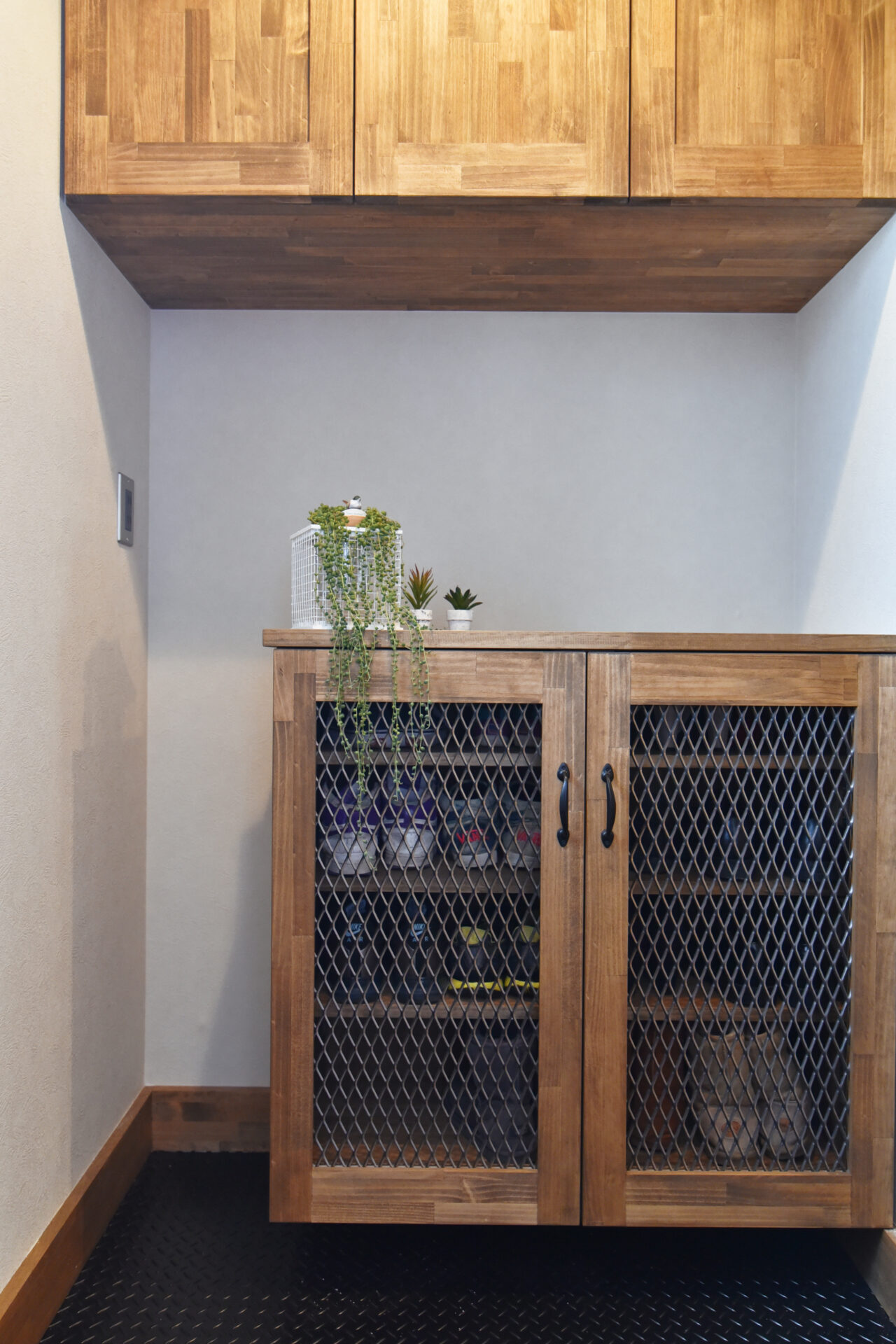 木の温もりとアイアンの質感を組み合わせたオリジナルデザインのシューズボックスを設置しました。