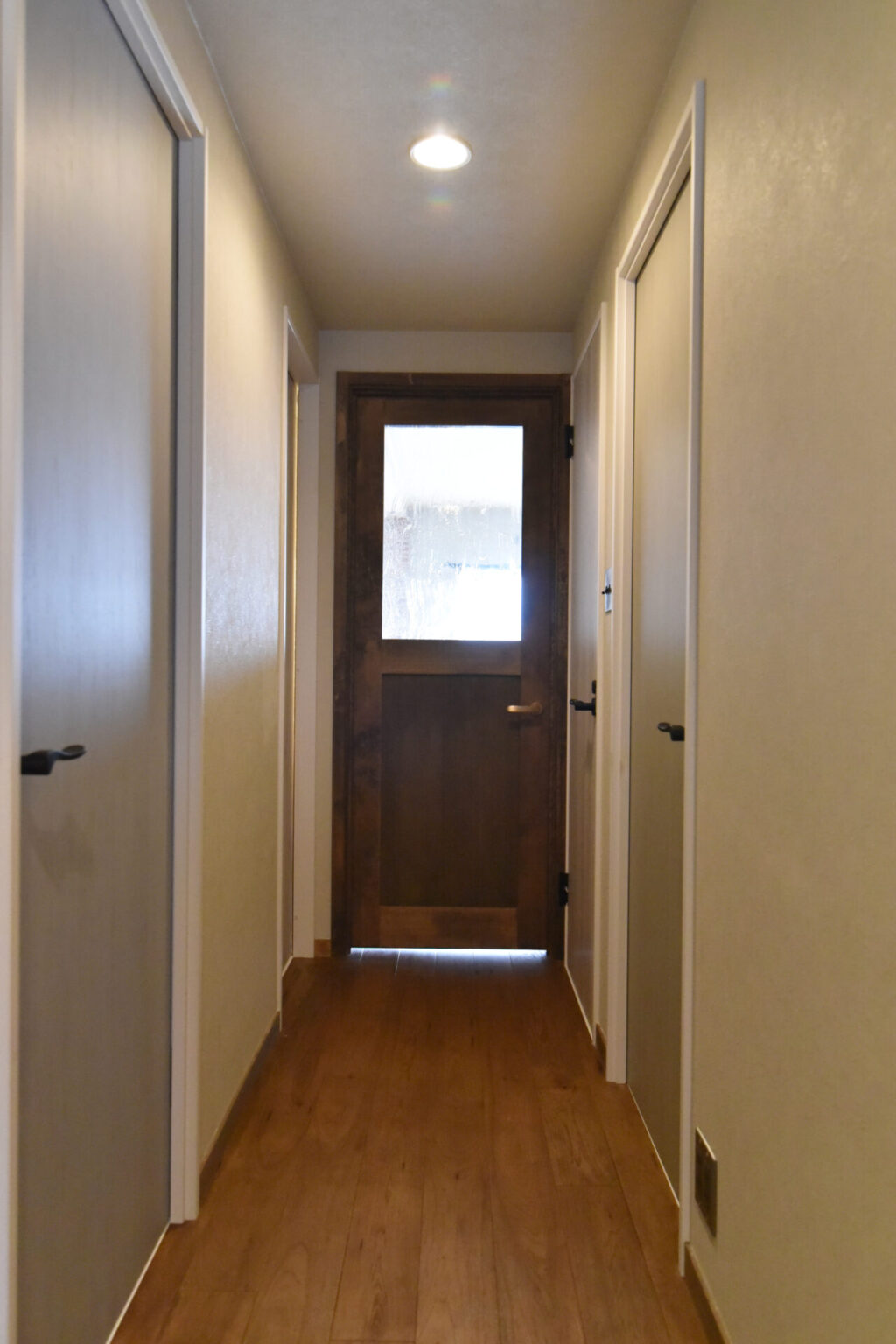 廊下からLDKへつながる木製ドアにはガラスを組み込み、光が廊下まで届く設計です。
