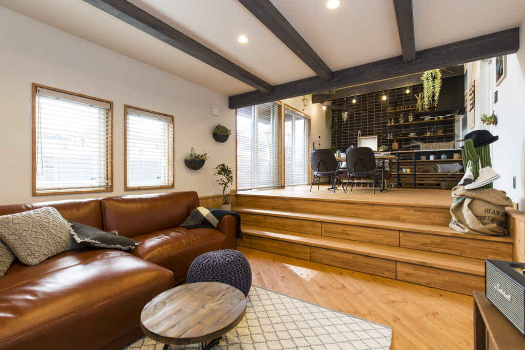 キッチン・ダイニングから半階下がった位置にあるリビングは、スキップフロア構造ならではの独特な落ち着きに包まれます。