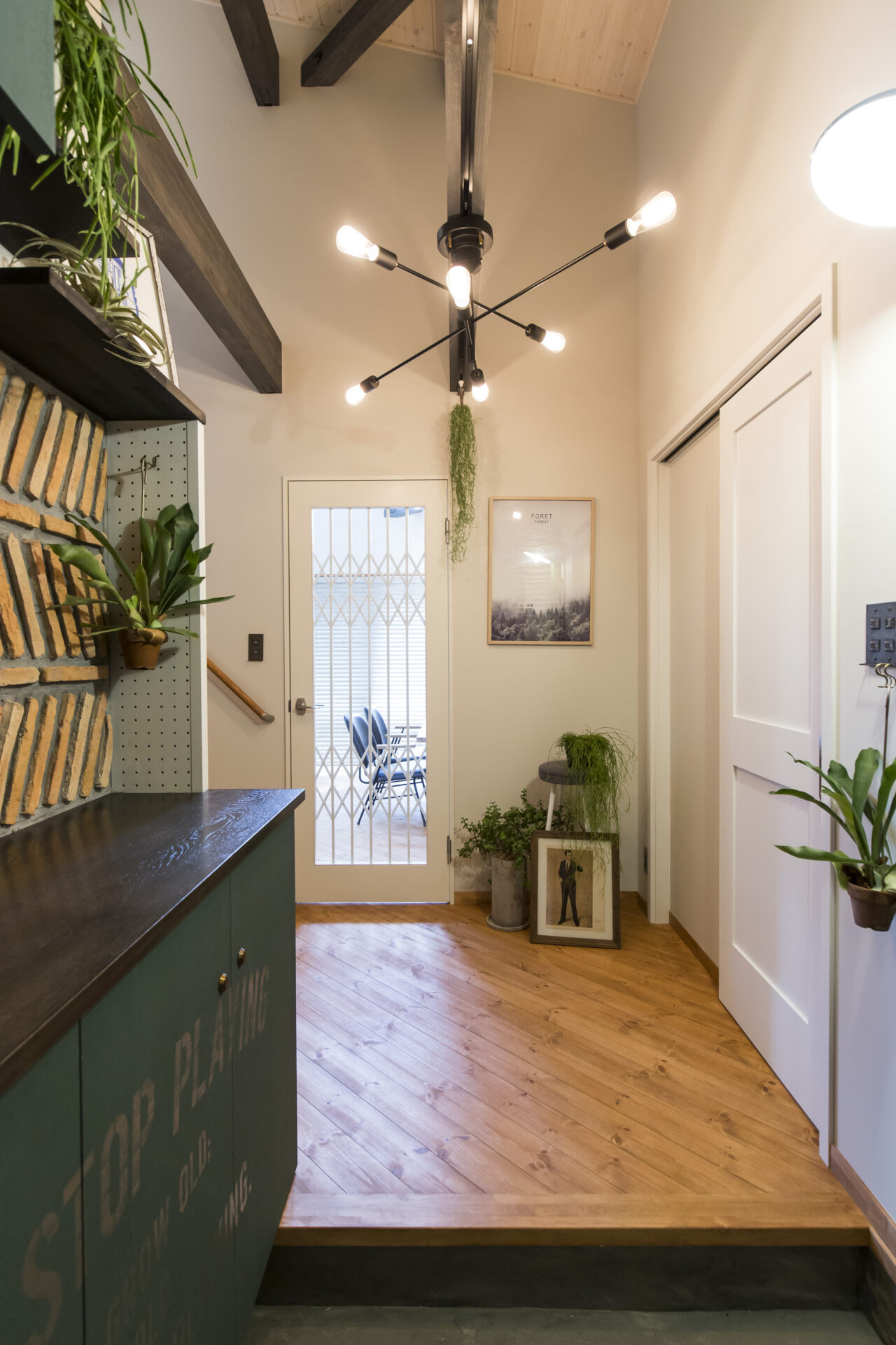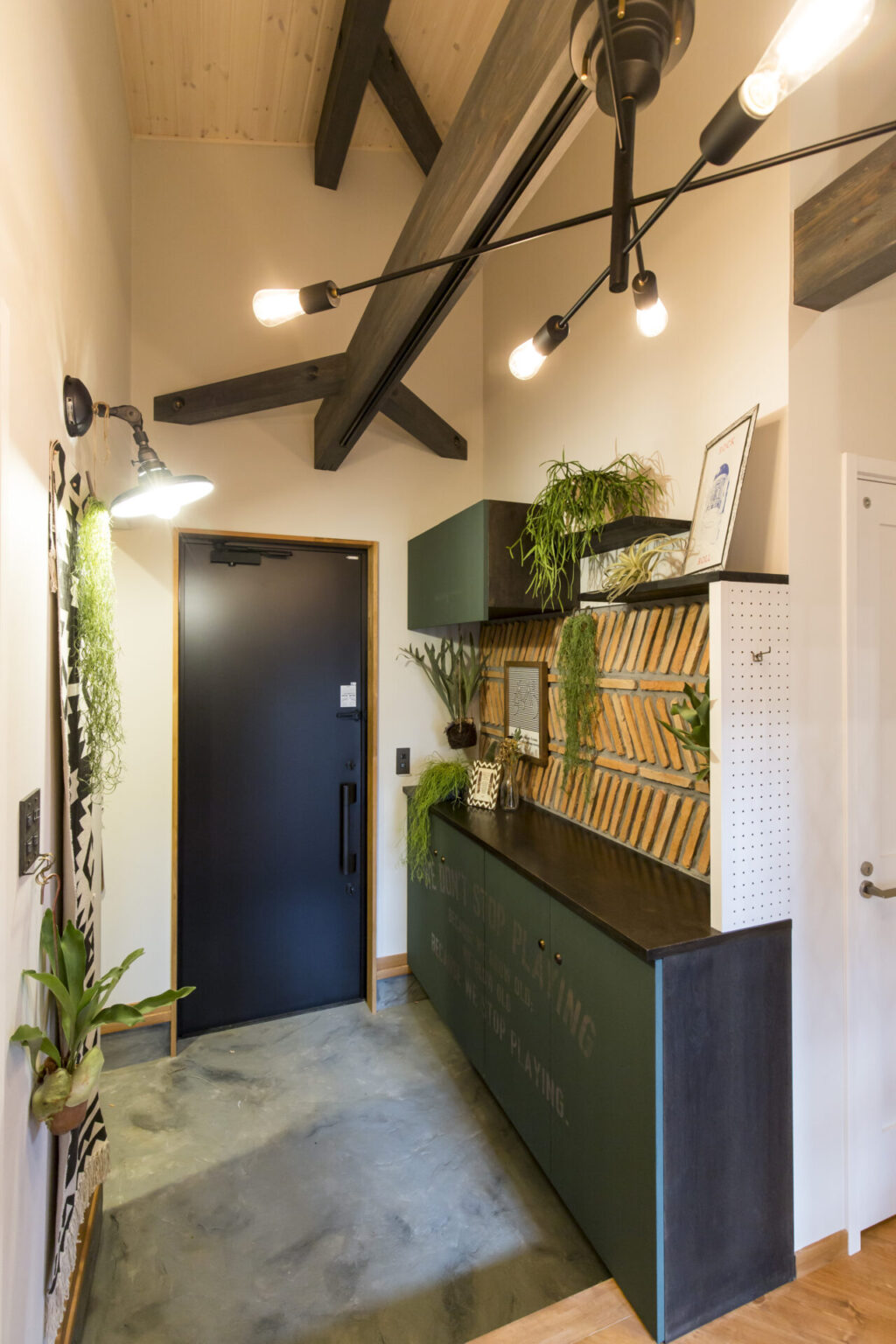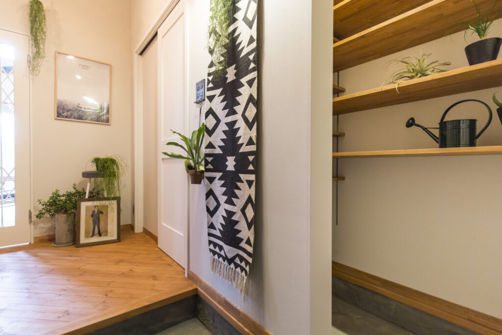 空間に馴染むオリジナルの下駄箱を設えたこの場所は、住み手のこだわりと「かっこいい暮らし」を予感させる、エッジの効いたエントランスです。