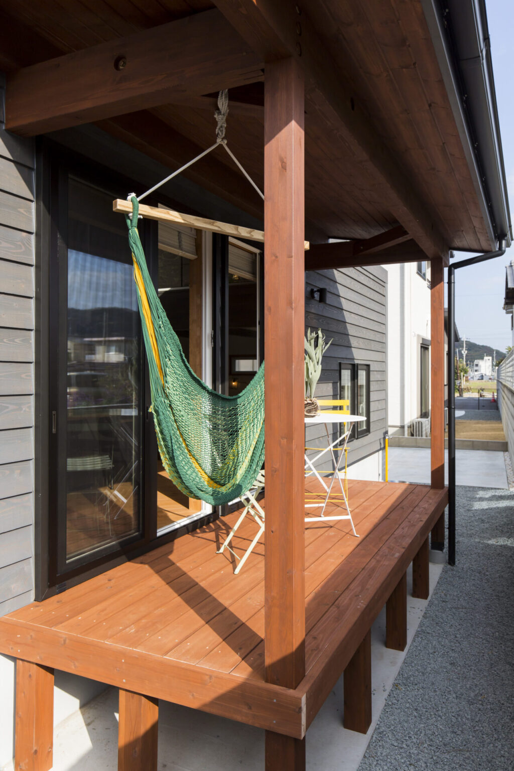 室内のフローリングと高さを合わせることで、内と外がひと続きになる開放感を創り出しました。