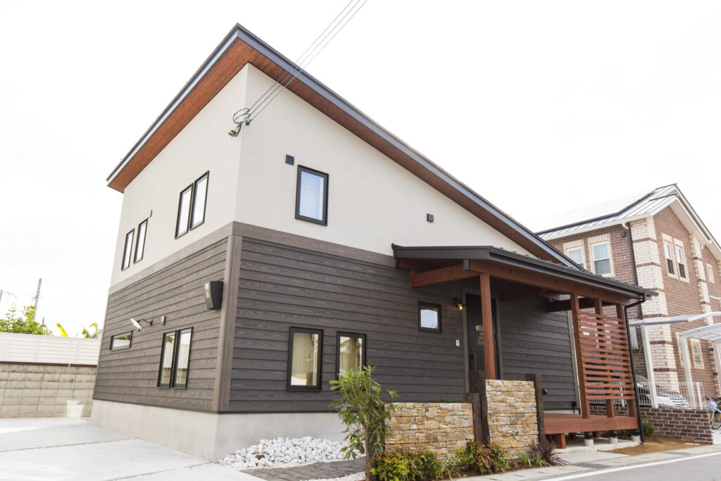 落ち着いたグレーの塗り壁を基調に、温かみのある木貼りをアクセントに添えた外観。