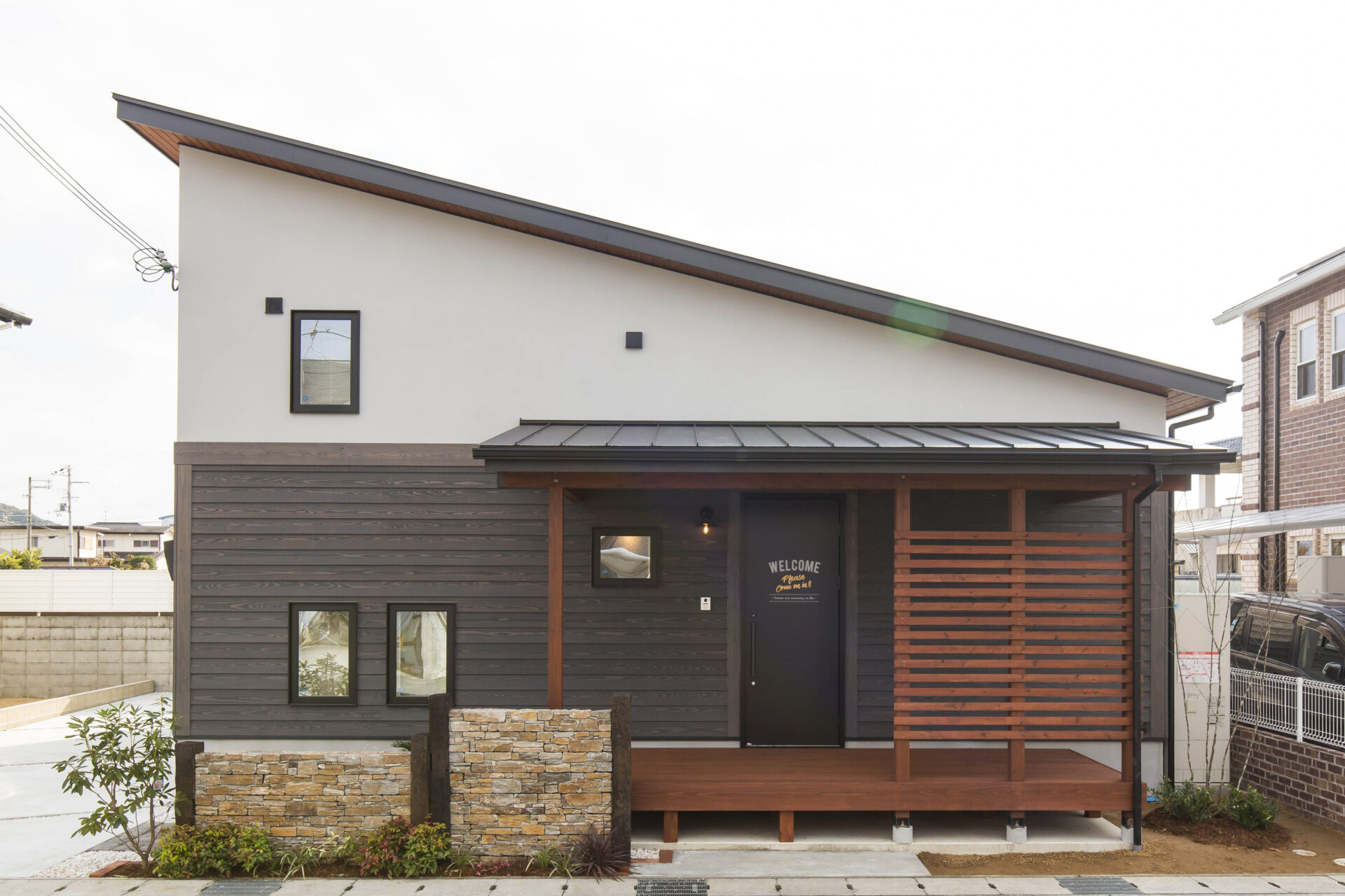 ●グレーの塗り壁に木貼りが映える、モダンな片流れの家