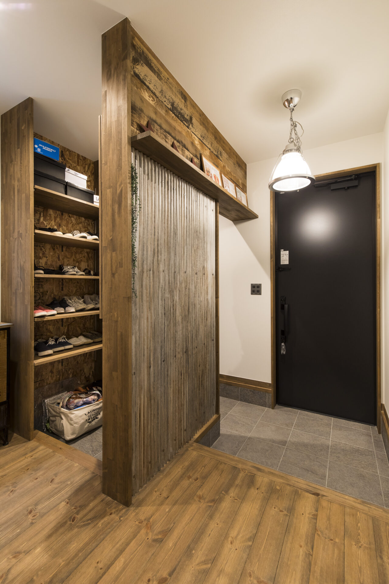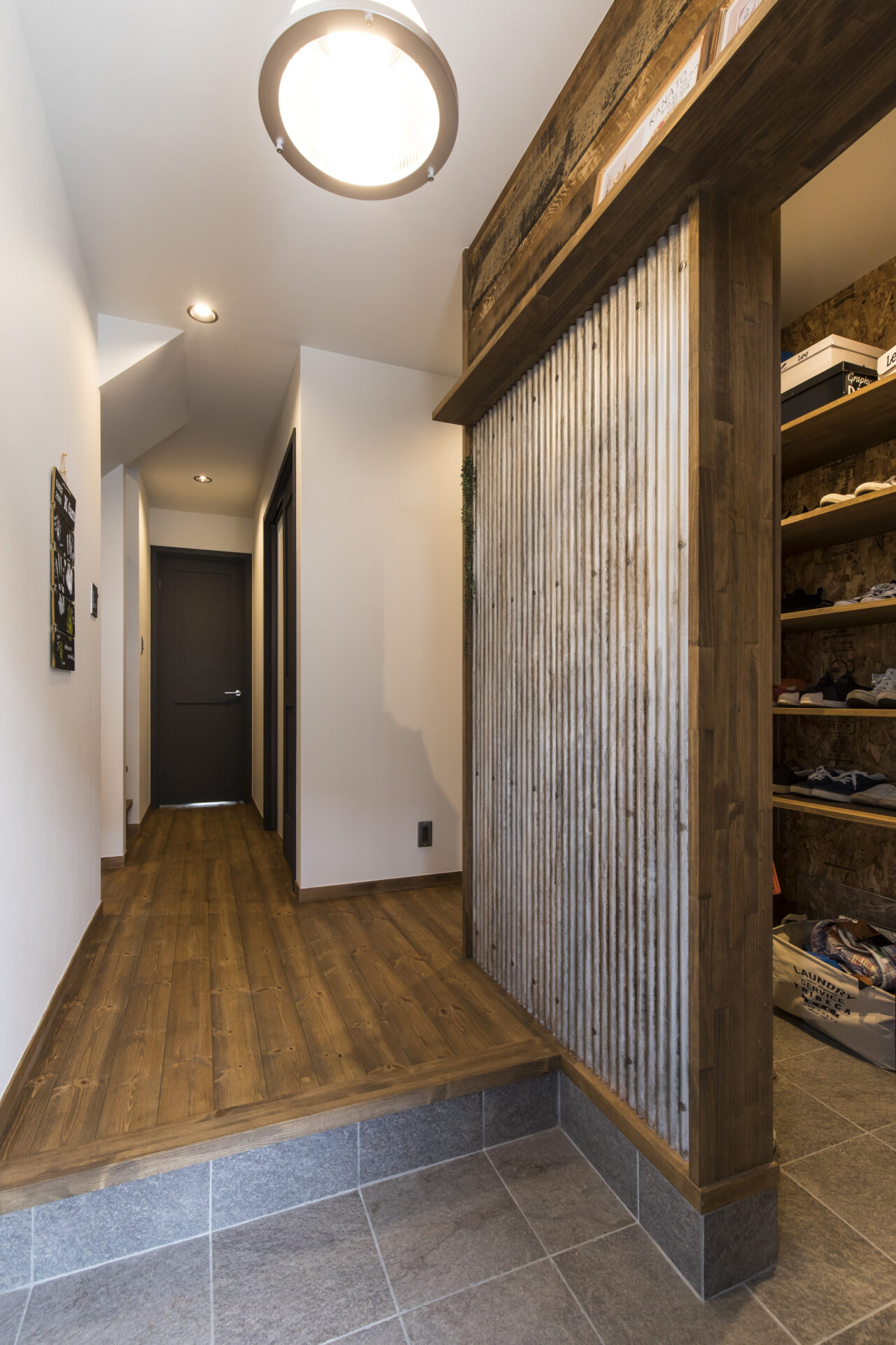 ●波板×古材の壁で仕切る機能的な玄関とシューズクローク