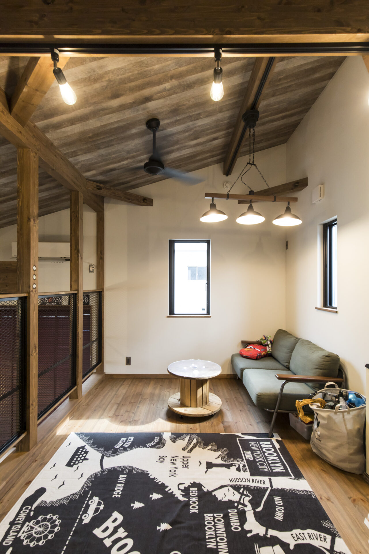 ●勾配天井の開放感とヴィンテージ木目が彩る、ワクワク広がるセカンドリビング