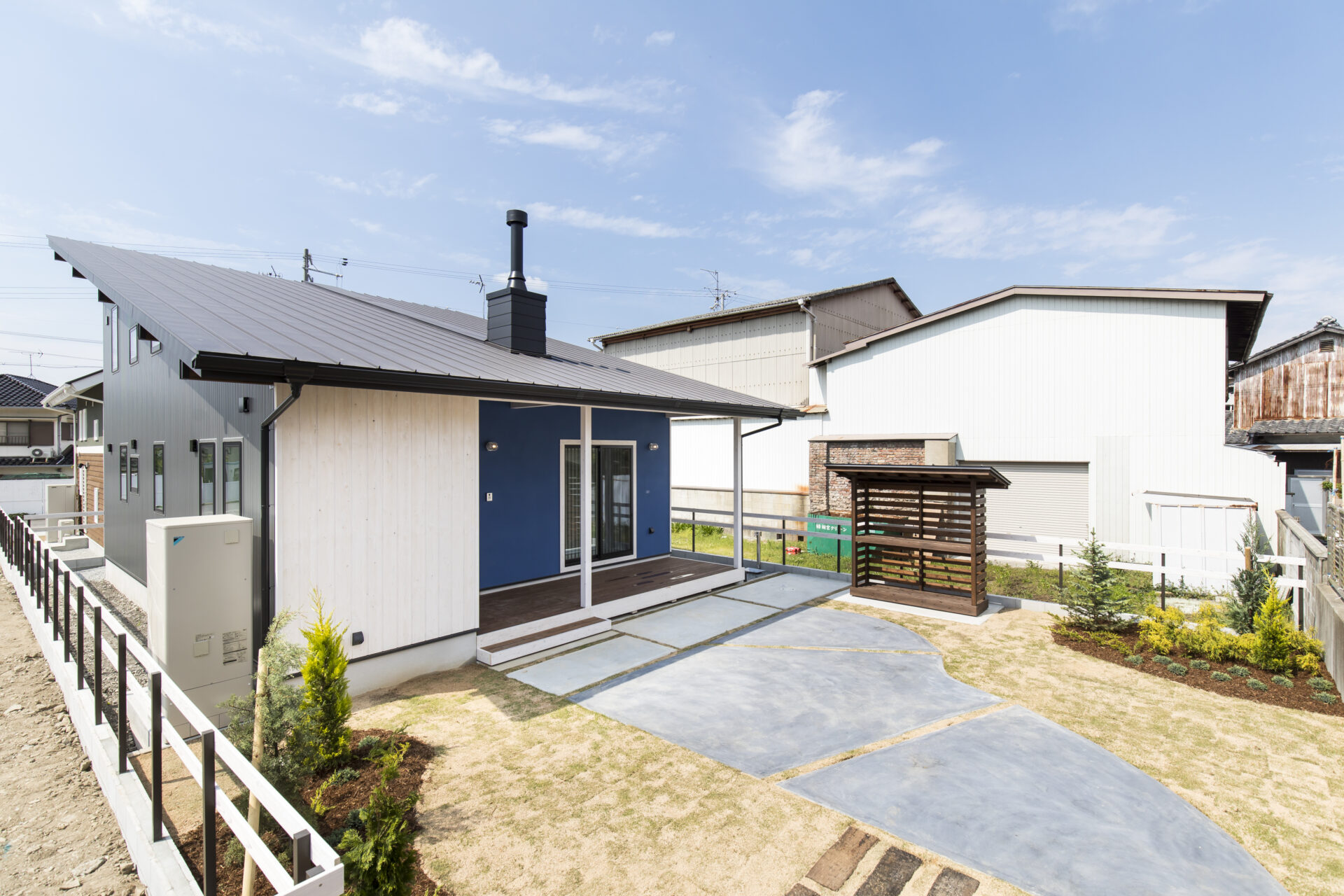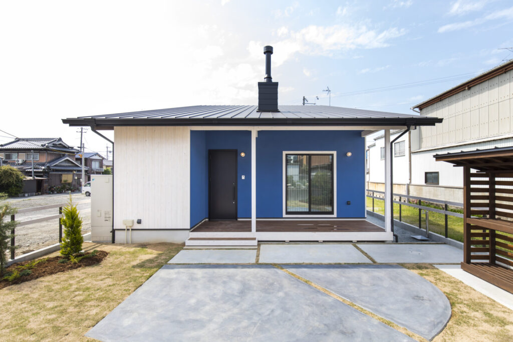 シルバーのガルバリウム鋼板をベースに、ブルーの塗り壁をアクセントとして取り入れ、すっきりとした中に個性が光る外観に仕上げました。