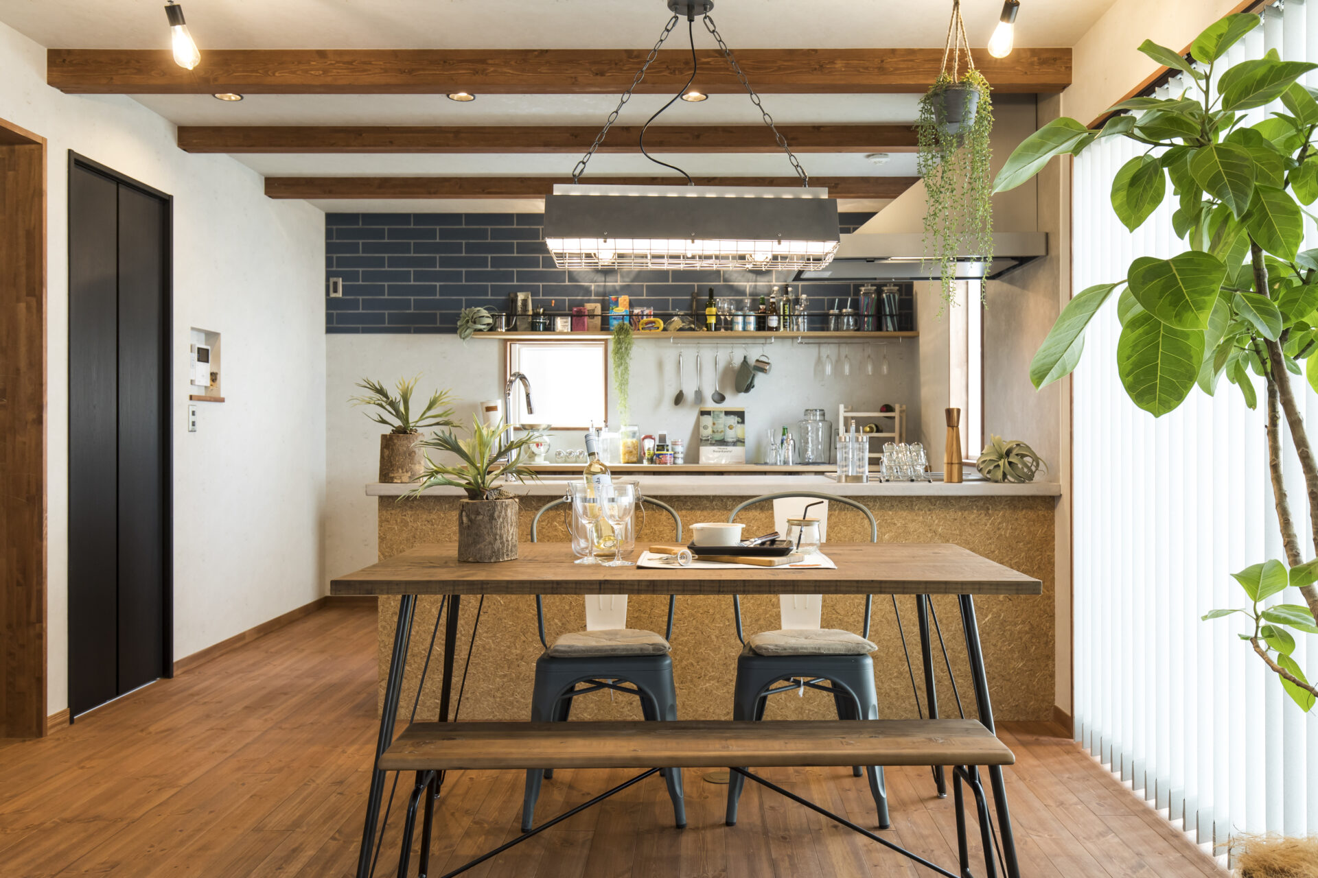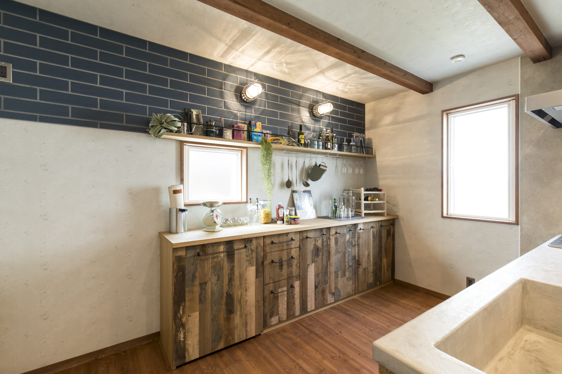 ラフさとおしゃれさが共存する、キッチンまわりの印象的なポイントです。