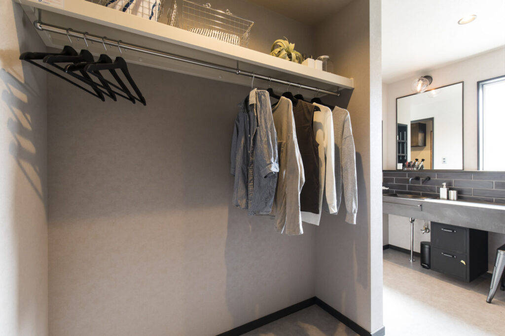 洗面脱衣室内には、室内干しやファミリークローゼットとして使えるスペースを確保。